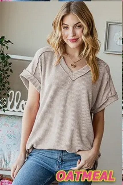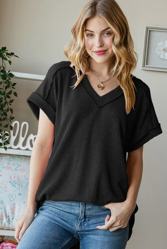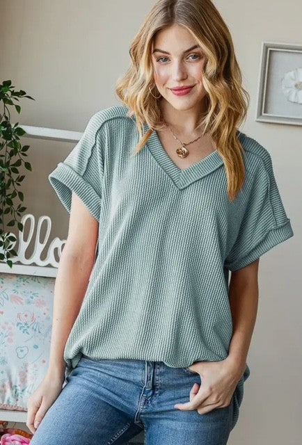 This top is one of our top transition pieces. It looks fantastic on its own, or add a flannel or jacket and take it into fall. Top features: dolman short-sleeve, ribbed body with a V-neckline band.